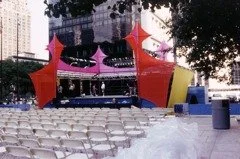 I was asked to design a stage that would stand out on the plaza of the World Trade Center, surrounded by very tall, grey buildings. This was for dance, music, and spoken word performances. The simple stage structure was clad on three sides with rip-stop nylon side walls in bright colours.